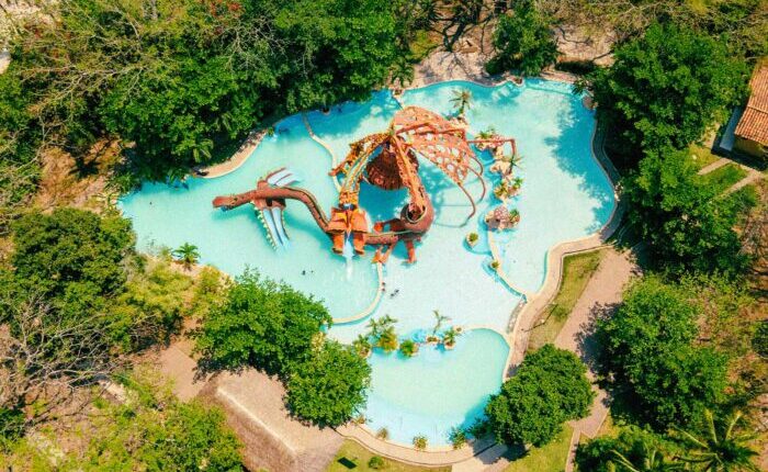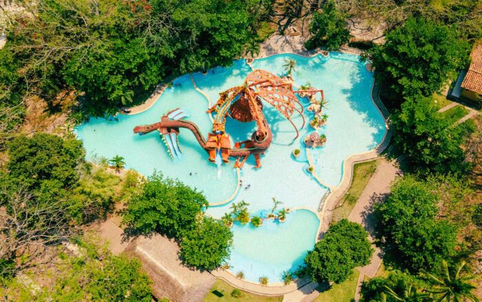 El parque acuático ofrece 10 albercas, incluida una alimentada por el nacimiento termal, así como toboganes, juegos infantiles, amplias áreas verdes y canchas para disfrutar sin prisa.