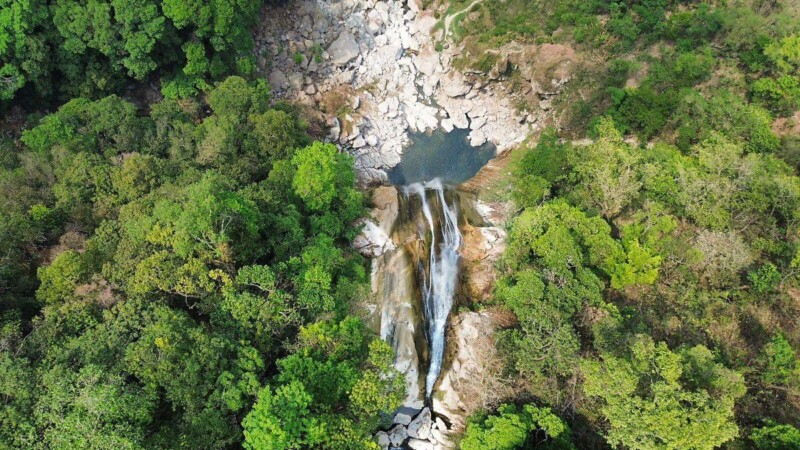 Poza: En la parte inferior, la cascada forma una poza de agua verde, ideal para nadar y refrescarse, especialmente en temporada seca.