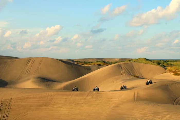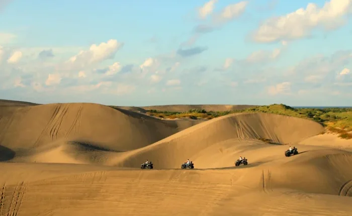 Aquí, el mar comparte protagonismo con enormes dunas doradas, ideales para practicar sandboarding o lanzarse en cuatrimoto.